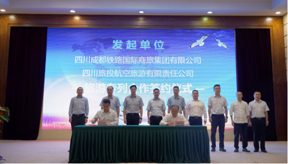 会上,四川旅投集团旗下旅投航旅公司和中铁成都局集团旗下成铁商旅公司签订了旅游专列项目合作协议,将投入各自优质资源,共同运营从四川、贵州、重庆境内城市车站始发、开往全国各地的旅游专列,共同发挥国有资本的带动作用,践行社会责任。签约结束后,大会为西南旅游专列联盟首批35家成员单位进行了授牌。